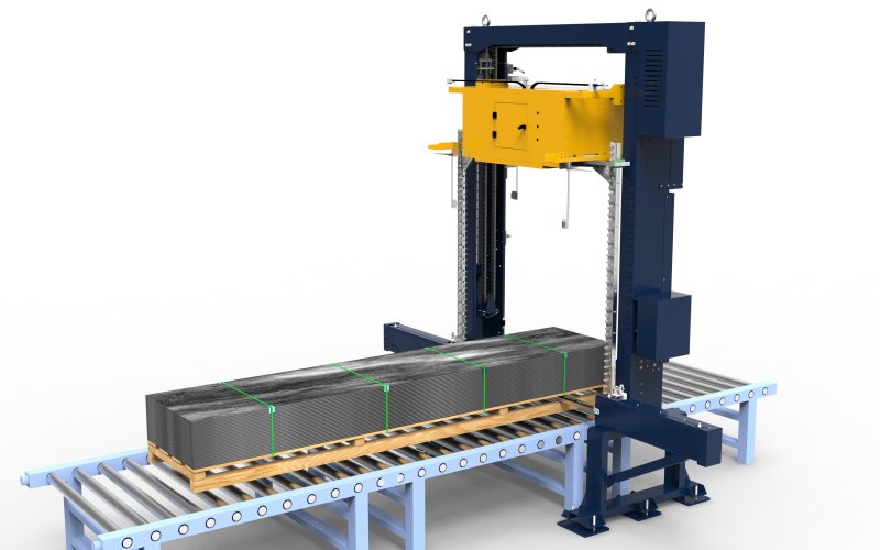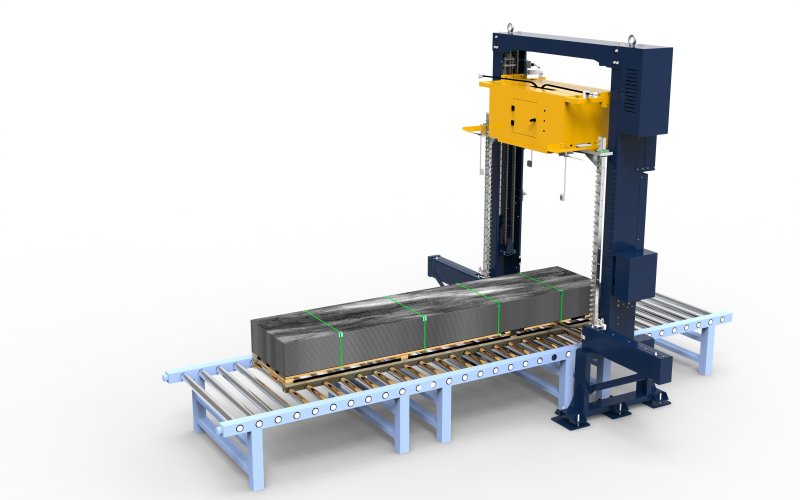 支持托盤尺寸 1000×1000mm~1500×1500mm(可定制),貨物高度≤2000mm(特殊高度可調整),最大承載重量達 3000kg,適配重型磚垛、金屬型材、大型設備配件、桶裝化工原料等多種貨物類型。兼容 1608、1910 等主流規格 PET 打包帶,支持再生 PET 帶穩定使用,幫助企業降低耗材成本。